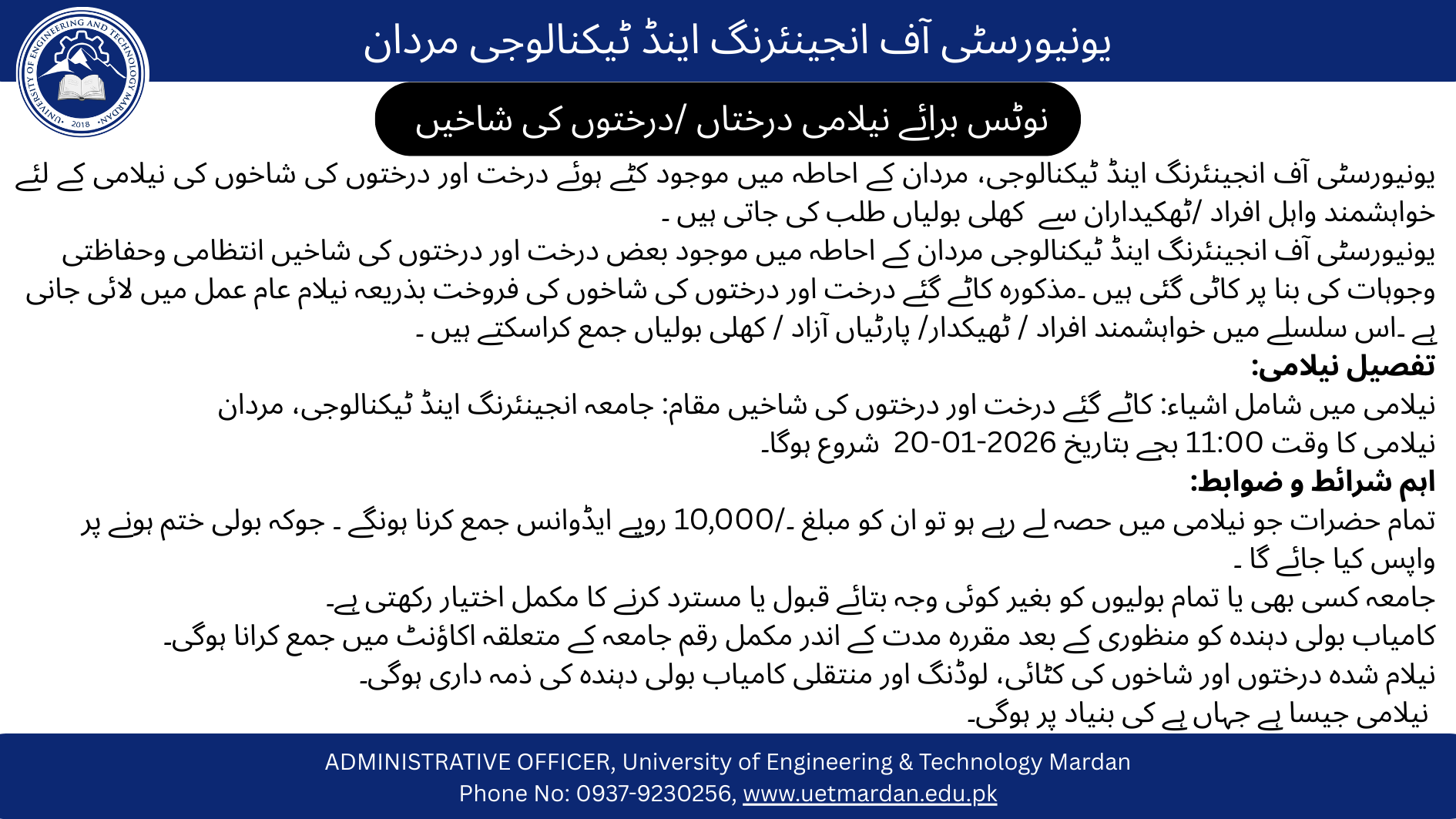 The submission deadline is set for 11:00 AM on 20th January 2026. Bids will be opened on the same day at the university premises. Interested parties should submit their sealed bids to the administrative office of the University of Engineering and Technology Mardan.