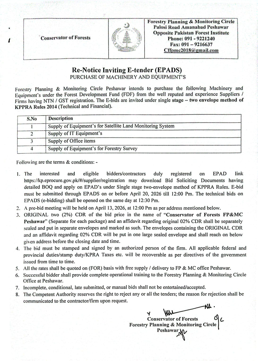 This tender from the Conservator of Forests, Forestry Planning and Monitoring Circle in Peshawar invites suppliers to provide specialized equipment including Satellite Land Monitoring systems, IT devices, office items, and forestry survey tools. The procurement focuses on enhancing forest monitoring capabilities through advanced technology and operational support in Peshawar.