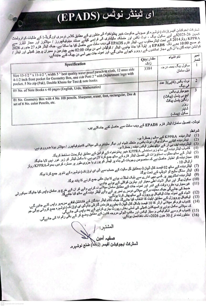 This tender invites suppliers to provide school bags, notebooks, and geometry boxes for girls schools in Nowshera under the 2025-26 KP PRA campaign. The District Education Office, Nowshera, requires high-quality waterproof parachute cloth school bags with department logos, notebooks in English, Urdu, and Mathematics, and geometry boxes with pencils and color pencils. These items are essential for supporting students' educational needs in the district.