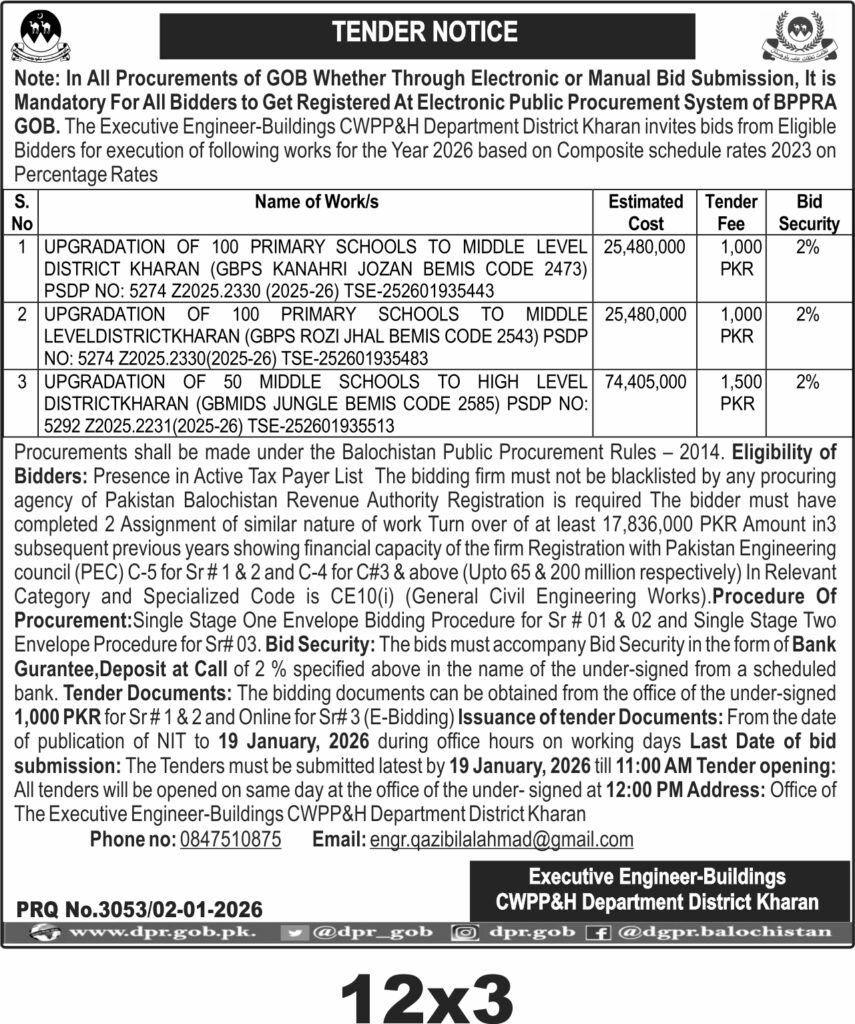 The submission deadline is set for 19 January 2026 at 11:00 AM, with tender opening at 12:00 PM on the same day at the office of the Executive Engineer-Buildings CWPP&H Department District Kharan. Tender documents for Sr #1 and #2 are available for PKR 1,000 in hard copy, while Sr #3 documents are accessible online for e-bidding. Bidders must submit bids in sealed envelopes accompanied by a 2% bid security in the form of a bank guarantee or deposit at call.