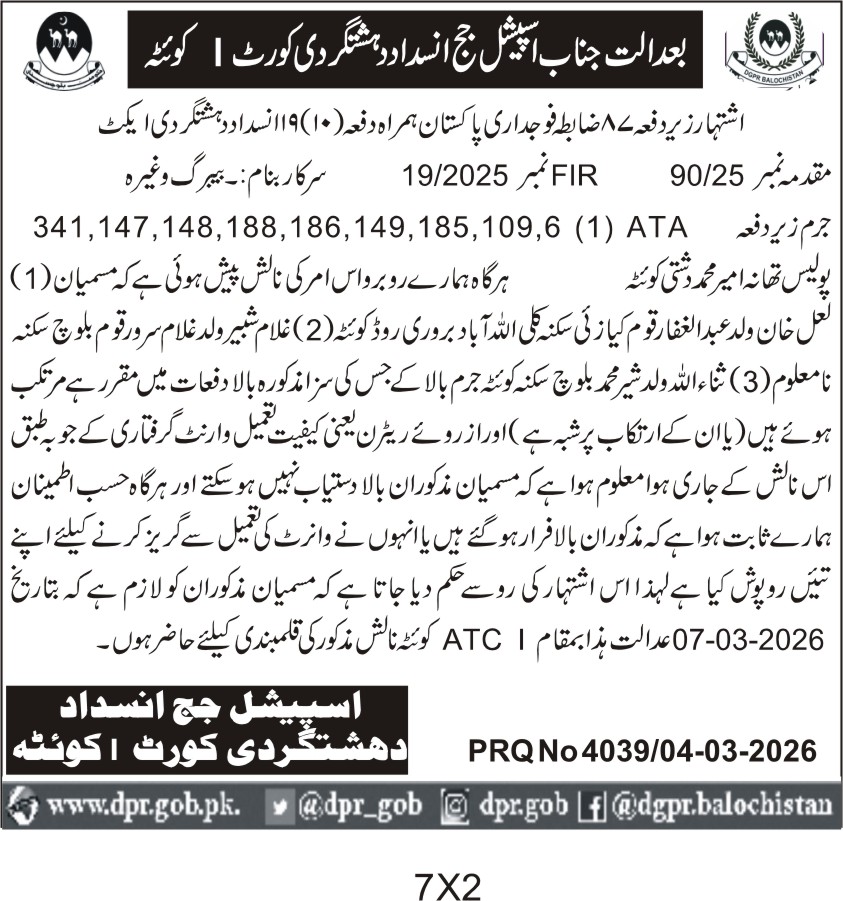 ποΈ Issuing Authority:Special Judge Anti-Terrorism Court Quetta