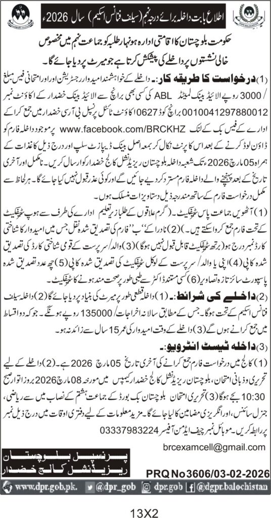 Admission to Self Finance Scheme for Reserved Seats at Balochistan Residential College Khuzdar for 2026