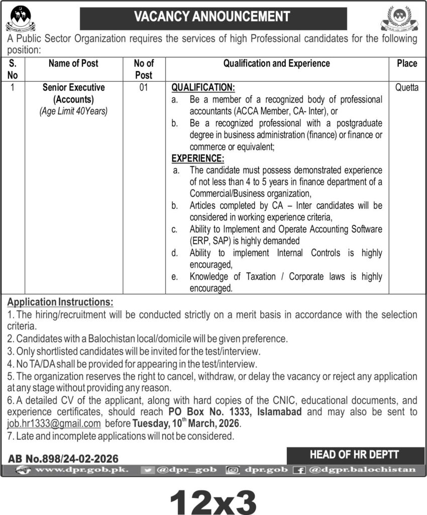 This recruitment opportunity is for the position of Senior Executive (Accounts) in Quetta under the Balochistan Public Sector Organization. The role demands a professional with strong accounting credentials and experience in finance, ideally suited for candidates with ACCA membership or equivalent qualifications.
