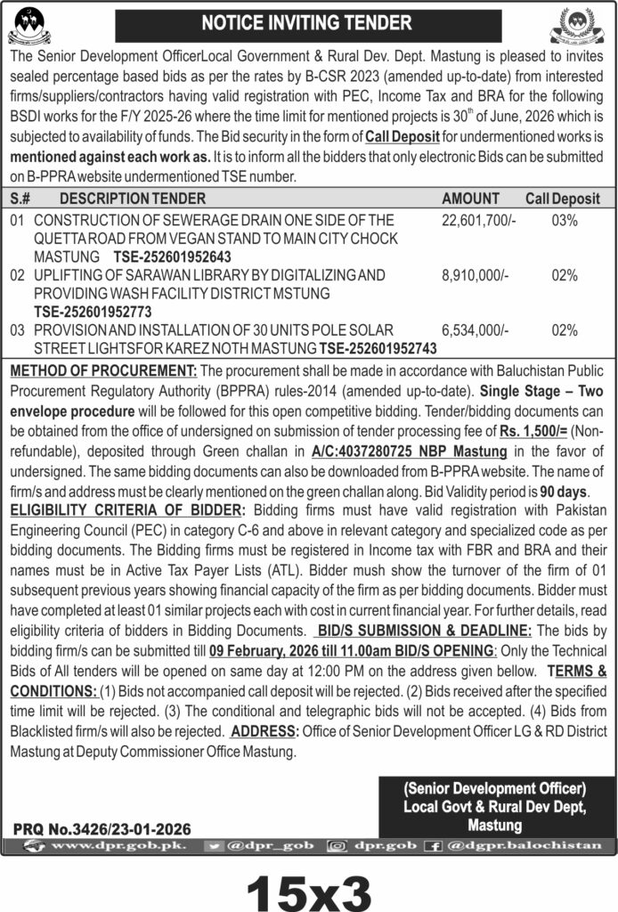 Submission deadline is set for 09 February 2026 at 11:00 AM, with technical bids opening the same day at 12:00 PM. Bids must be submitted electronically via the B-PPRA website. Tender documents are available upon payment of a non-refundable fee of PKR 1,500 through a green challan to NBP Mastung. The office of the Senior Development Officer at the Deputy Commissioner Office Mastung is the contact point for further details.