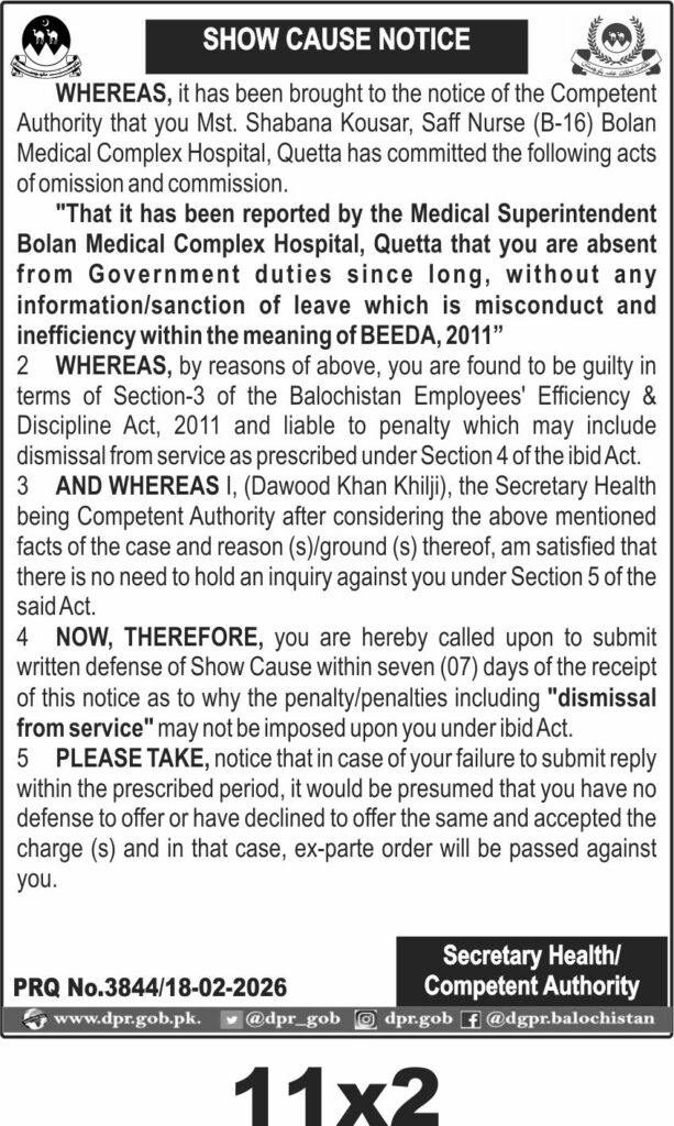 Show Cause Notice for Absence from Government Duties at Bolan Medical Complex Hospital Quetta