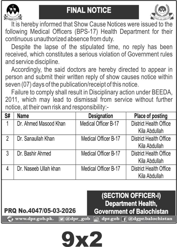Show Cause Notice for Medical Officers BPS-17 at District Health Office Kila Abdullah