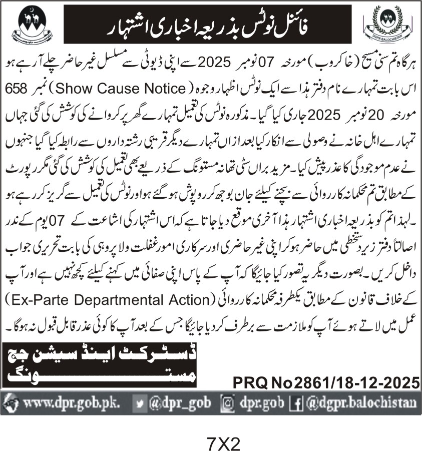 Interested parties are given a final opportunity to respond by 7 days from the notice date. The notice is issued by the District and Session Judge Mastung and emphasizes compliance with legal procedures to avoid ex-parte departmental action.
