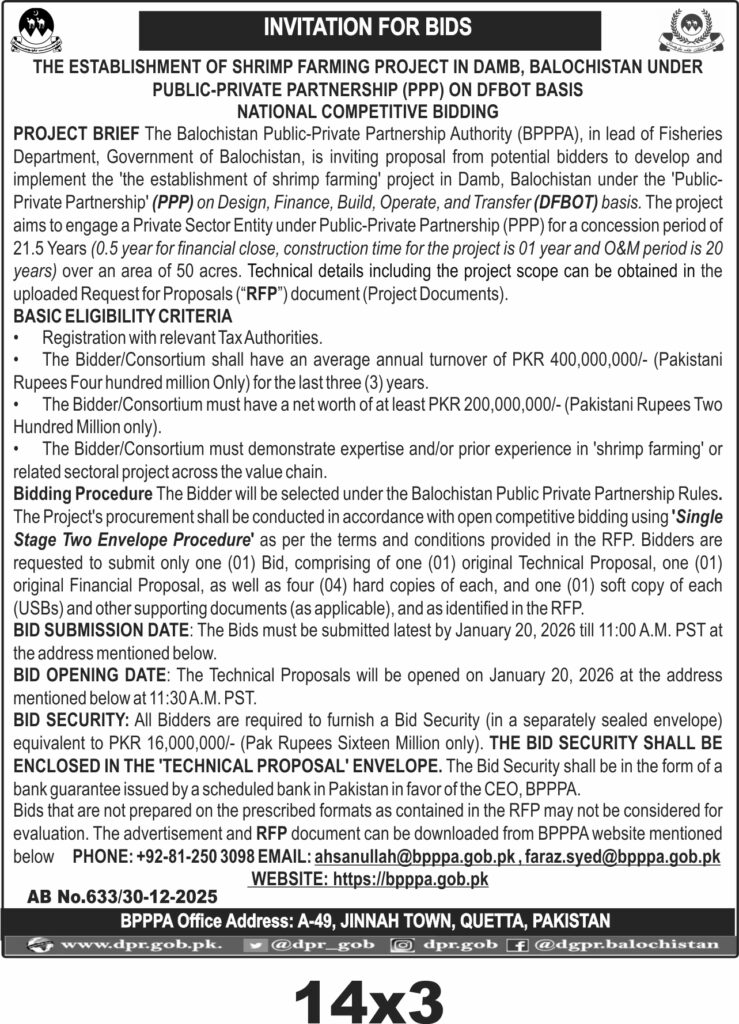 This tender invites qualified bidders in Quetta from the Balochistan Public-Private Partnership Authority (BPPPPA) for a shrimp farming project under the Public-Private Partnership (PPP) model. The project falls under Agricultural Inputs & Equipment category and aims to develop shrimp farming on a 50-acre site in Damb, Balochistan.