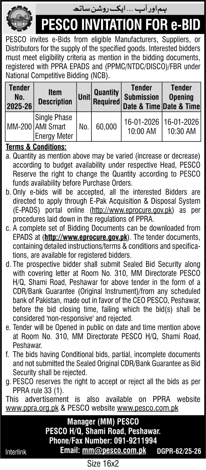 The submission deadline is set for 16th January 2026 at 10:00 AM, with bid opening scheduled for 10:30 AM the same day. Physical bid security and covering letters must be delivered to Room No. 310, MM Directorate, PESCO Headquarters, Shami Road, Peshawar. Late or incomplete bids will be rejected.