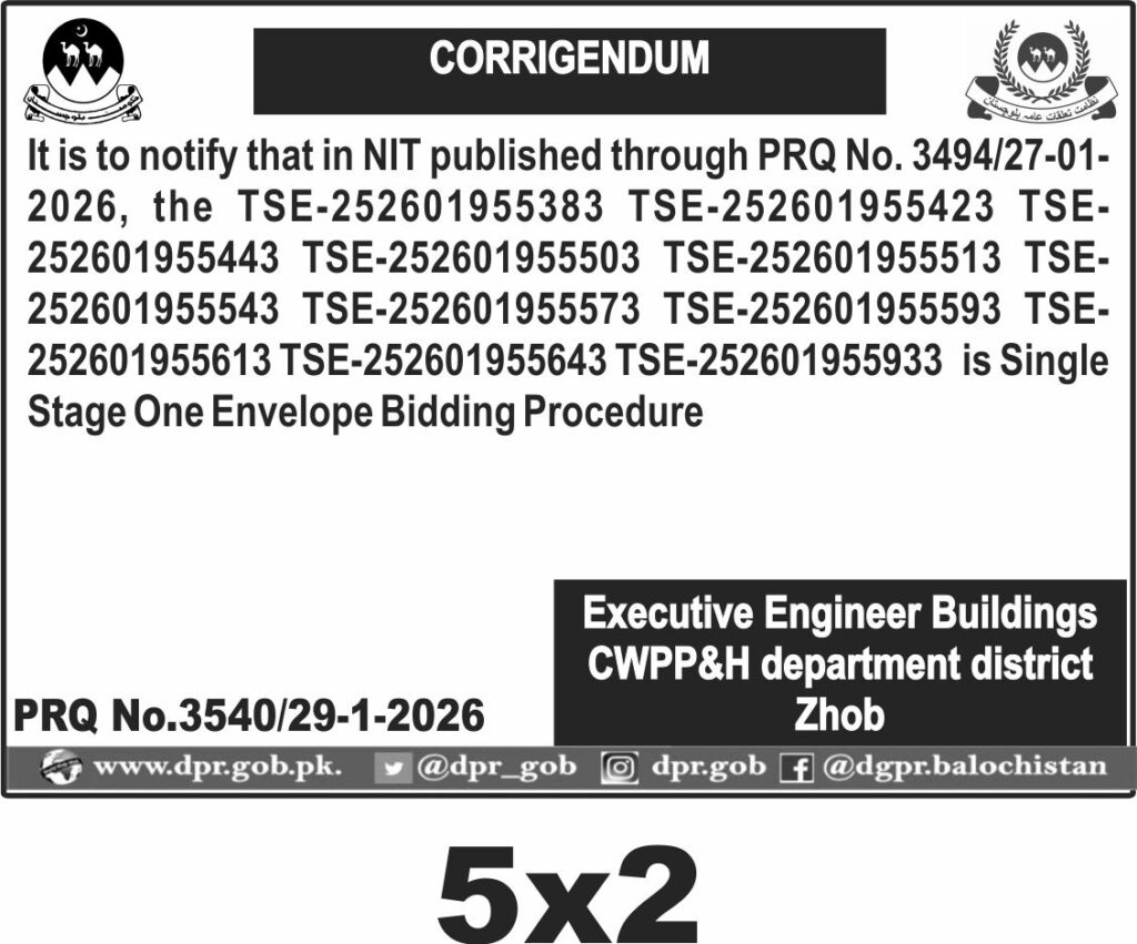The submission deadline is set for 29th January 2026, with bids opening on the same day. Interested parties must submit their sealed bids to the office of the Executive Engineer Buildings CWPP&H Department, Zhob, before the closing time. Late submissions will not be entertained, so punctuality is crucial.