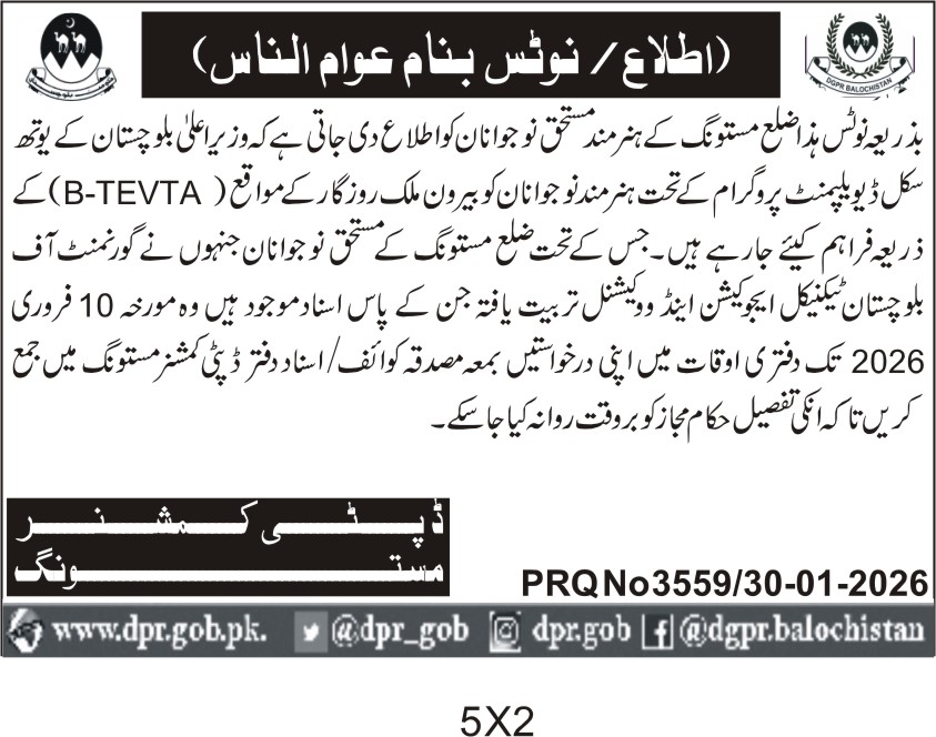 This tender notice from Mastung city under the Balochistan Technical Education and Vocational Training Authority (B-TEVTA) invites skilled youth to participate in a government-backed skill development program. The initiative aims to empower local youth by providing them with vocational training opportunities that enhance their employability across Pakistan. The program focuses on practical skill acquisition aligned with market demands, ensuring participants gain relevant expertise.