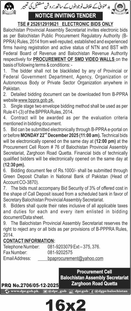 The procurement involves supply of SMD video walls with bidding documents available on B-PPRA website. Technical and financial bids will be opened on 22nd December 2025 at the Secretariat's Procurement Cell Room on Zarghoon Road Quetta.