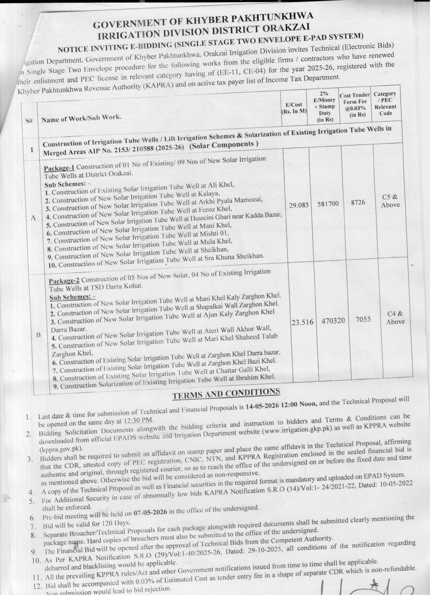 The Irrigation Division District Orakzai under the Government of Khyber Pakhtunkhwa is procuring construction services for solar irrigation tube wells and lift irrigation schemes. This project involves the construction and solarization of existing and new irrigation tube wells across multiple sites in Orakzai, including Ali Khel, Kalaya, Arkhi Pyala Mamozai, Feroz Khel, and others. The procurement is divided into two packages: Package-1 includes 1 existing and 9 new solar irrigation tube wells, while Package-2 covers 5 new and 4 existing tube wells at TSD Darra Kohat.