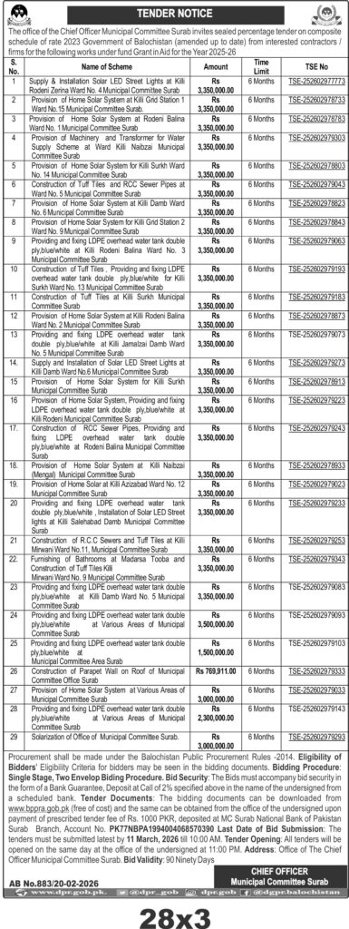 The submission deadline is set for 11 March 2026 at 10:00 AM, with technical bids opening the same day at 11:00 AM at the office of the Chief Officer Municipal Committee Surab. Bidders must submit sealed bids following the two-envelope procedure, ensuring earnest money compliance and timely delivery.