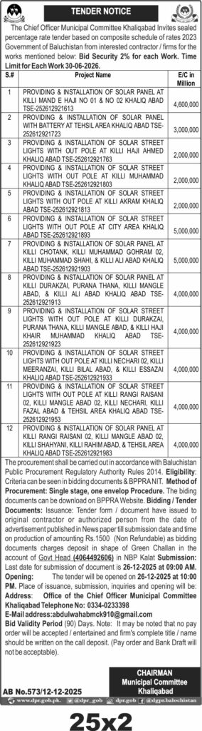 Eligibility criteria and bidding documents are available on the BPPRA website. The last date for submission is 26-12-2025 at 09:00 AM with bid validity of 90 days. Contact details and submission instructions are provided by the Municipal Committee Khaliqabad.