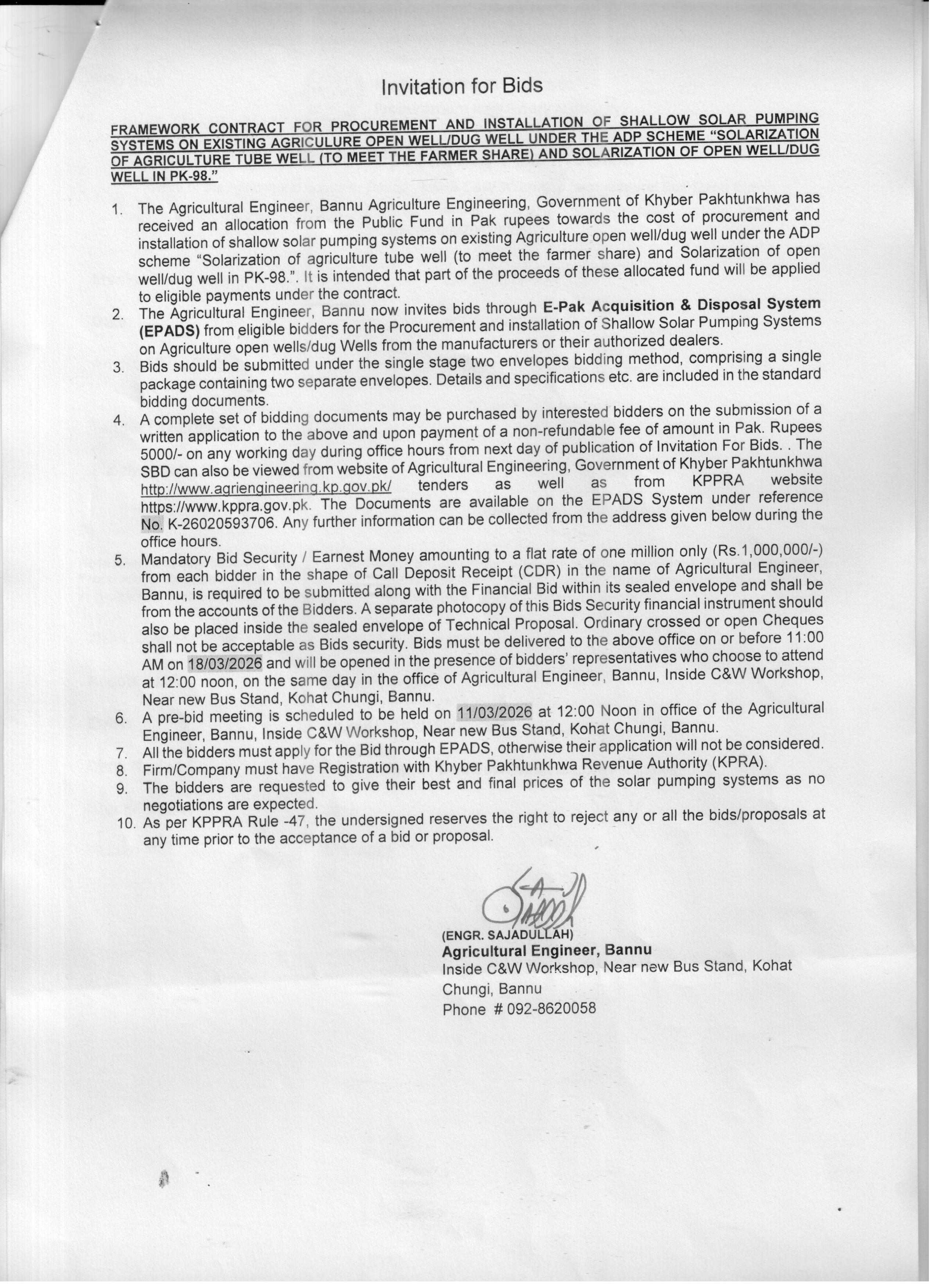 ποΈ Issuing Authority:Agricultural Engineer, Bannu Agriculture Engineering, Government of Khyber Pakhtunkhwa