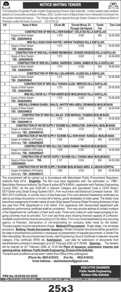 Submission deadline is set for 20th February 2026 at 11:00 AM, with tender opening at 12:00 PM the same day. Documents must be submitted physically at the Public Health Engineering Division office in Killa Saifullah. Tender fees and earnest money must be submitted as per instructions, including Call Deposit Receipt. The tender follows a single stage, one envelope procurement method.