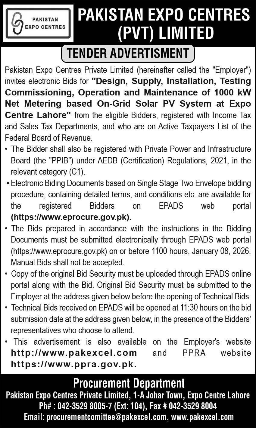 This tender invites electronic bids for the design, supply, installation, testing, commissioning, operation, and maintenance of a 1000 kW net metering based on-grid solar PV system at Expo Centre Lahore. Bidders must be registered with Income Tax, Sales Tax Departments, and on the Active Taxpayers List of FBR.
