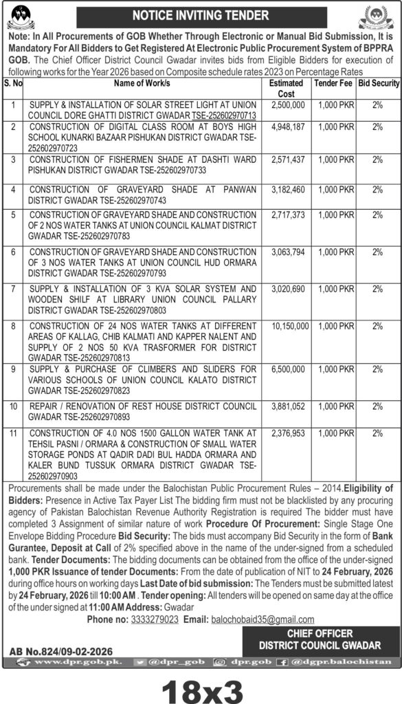 The last date for bid submission is 24 February 2026 by 10:00 AM, with tender opening scheduled the same day at 11:00 AM at the District Council Gwadar office. Tender documents are available from the date of publication until 24 February 2026 during office hours upon payment of a PKR 1,000 fee.