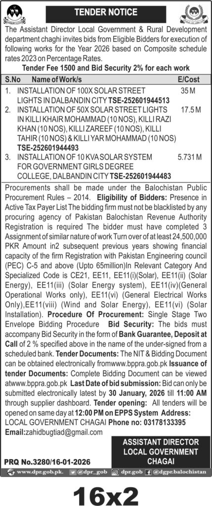 Interested bidders should note the submission deadline is set for 30 January 2026 at 11:00 AM, with tender opening scheduled the same day at 12:00 PM via the Electronic Procurement System (EPPS). Bids must be submitted electronically through the supplier dashboard. The physical address for correspondence is the Local Government office in Chagai. Ensure bid security of 2% of the estimated cost is provided via bank guarantee or call deposit receipt as per instructions.