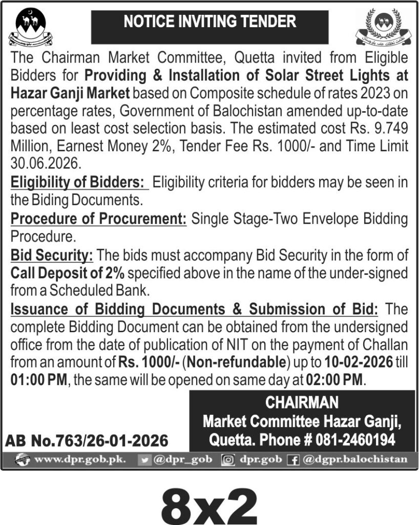 This tender invites qualified bidders in Quetta from the Market Committee Hazar Ganji for the provision and installation of solar street lights at Hazar Ganji Market. The project falls under the Power, Electrical & Solar Equipment category and aims to enhance street lighting using solar technology, promoting energy efficiency and sustainability in the market area.