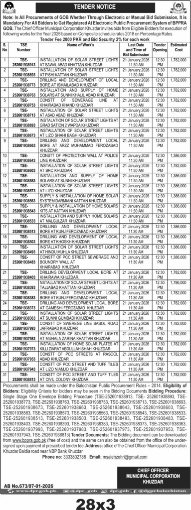 The submission deadline is set for 21 January 2026 at 11:30 AM, with bid opening scheduled at 12:30 PM the same day. Bids must be submitted physically to the office of the Chief Officer Municipal Corporation Khuzdar, located near NBP Bank Khuzdar on Baldia Road.