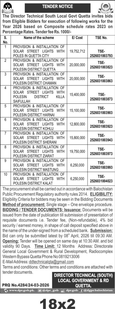 This tender invites bids for the provision and installation of solar street lights with poles across Quetta city and its surrounding districts including Chaman, Killa Saifullah, Harnai, Kohlu, Sherani, Ziarat, Mastung, and Kalat. The Local Government & Rural Development Department in Quetta seeks qualified contractors to execute these works under composite schedule rates for the year 2026.