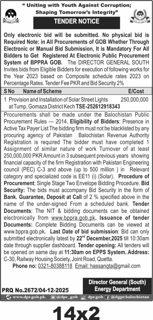 Bids must be submitted electronically by 22nd December 2025 at 10:30 am via the supplier dashboard. Tender documents are available online at www.bppra.gob.pk. Contact details include phone 0321-80388118 and email hassanqta@gmail.com for further information.