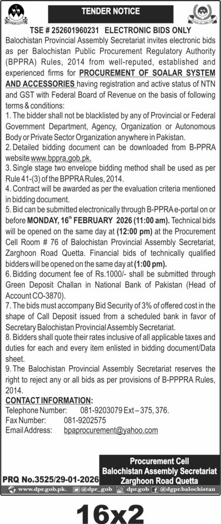 Procurement of Solar System and Accessories for Balochistan Provincial Assembly Secretariat