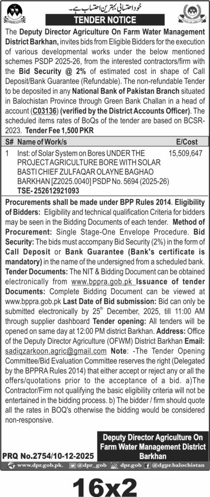 This tender invites bids for installation of solar systems on bores under the Agriculture Bore Project in Barkhan, Balochistan. The procurement covers solar power equipment and related civil works for farm water management. Bidders must submit bids electronically by the specified deadline.