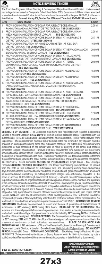 The works include installation of solar systems at bore sites and homes across Loralai and Duki districts, covering areas such as Malik Rahim Uthmankhail, Haji Khan Kibzai, Nasirabad, Killi Safi, New Kachamakzai, and others. The tender requires contractors to have relevant registration, experience, and financial capacity with a validity period of ninety days.