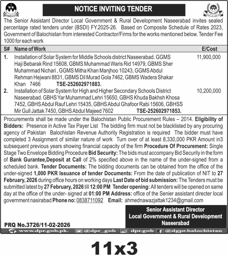 The submission deadline is 27 February 2026 by 12:00 PM, with bid opening at 1:00 PM the same day at the office of the Senior Assistant Director Local Government Naseerabad. Interested bidders should submit sealed bids following the Single Stage Two Envelope procedure.