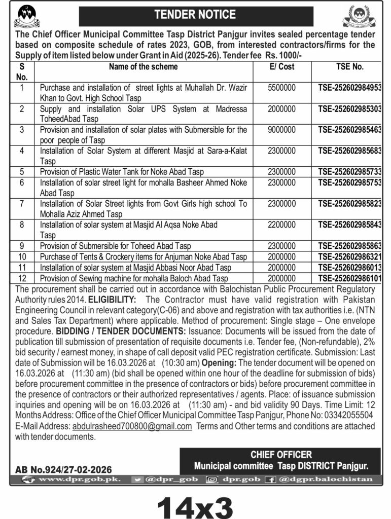This tender from the Municipal Committee Tasp District Panjgur in Balochistan invites contractors for the supply and installation of solar UPS systems, solar plates with submersibles, street lights, and plastic water tanks. The procurement focuses on electrical and solar equipment along with civil works for installation across various locations in Tasp.