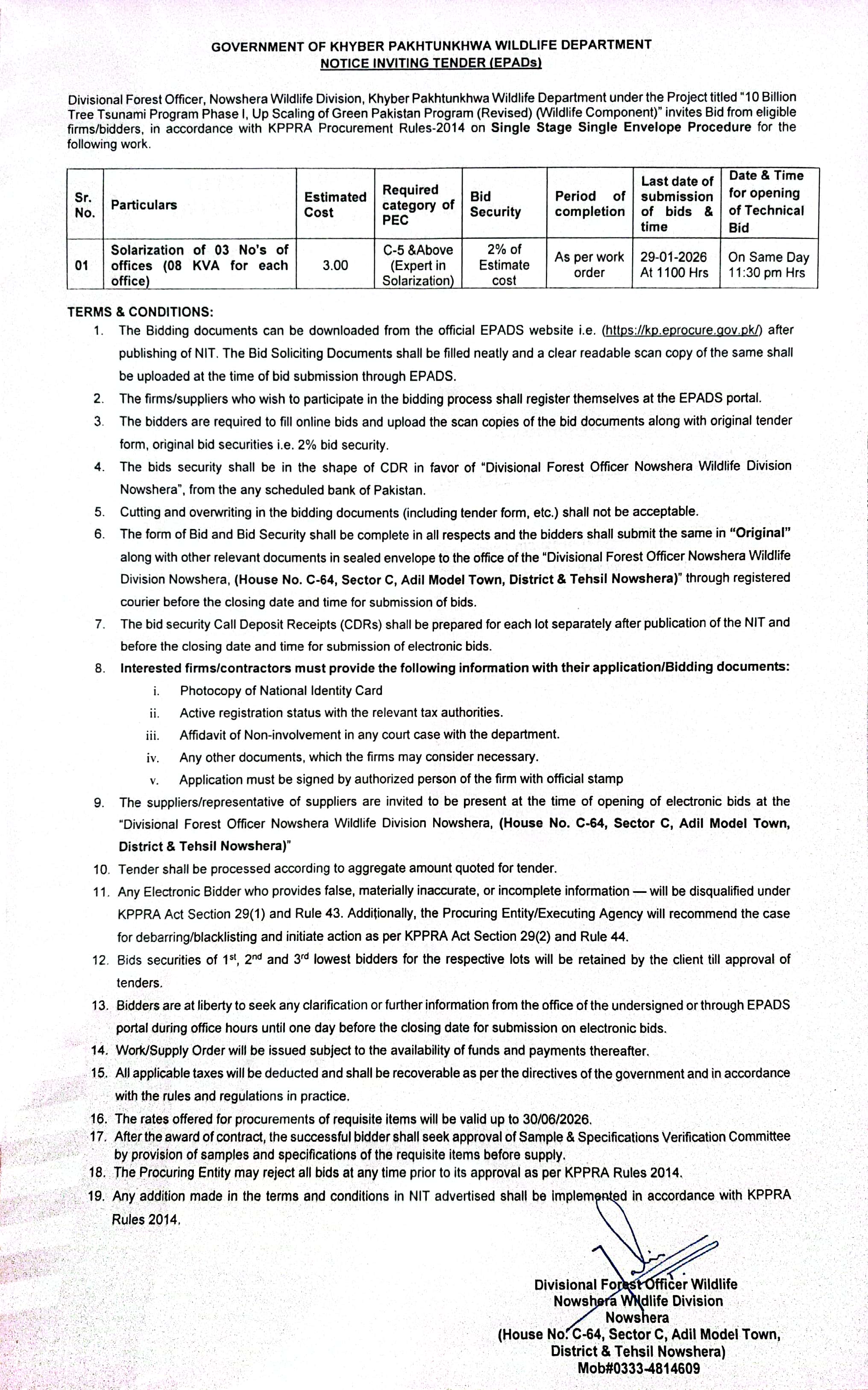 The submission deadline is set for 29th January 2026 at 11:00 AM, with technical bids opening the same day at 11:30 AM. Physical bid submissions must be delivered to the Divisional Forest Officer's office at House No. C-64, Sector C, Adil Model Town, District & Tehsil Nowshera. Bidders are advised to attend the bid opening in person.