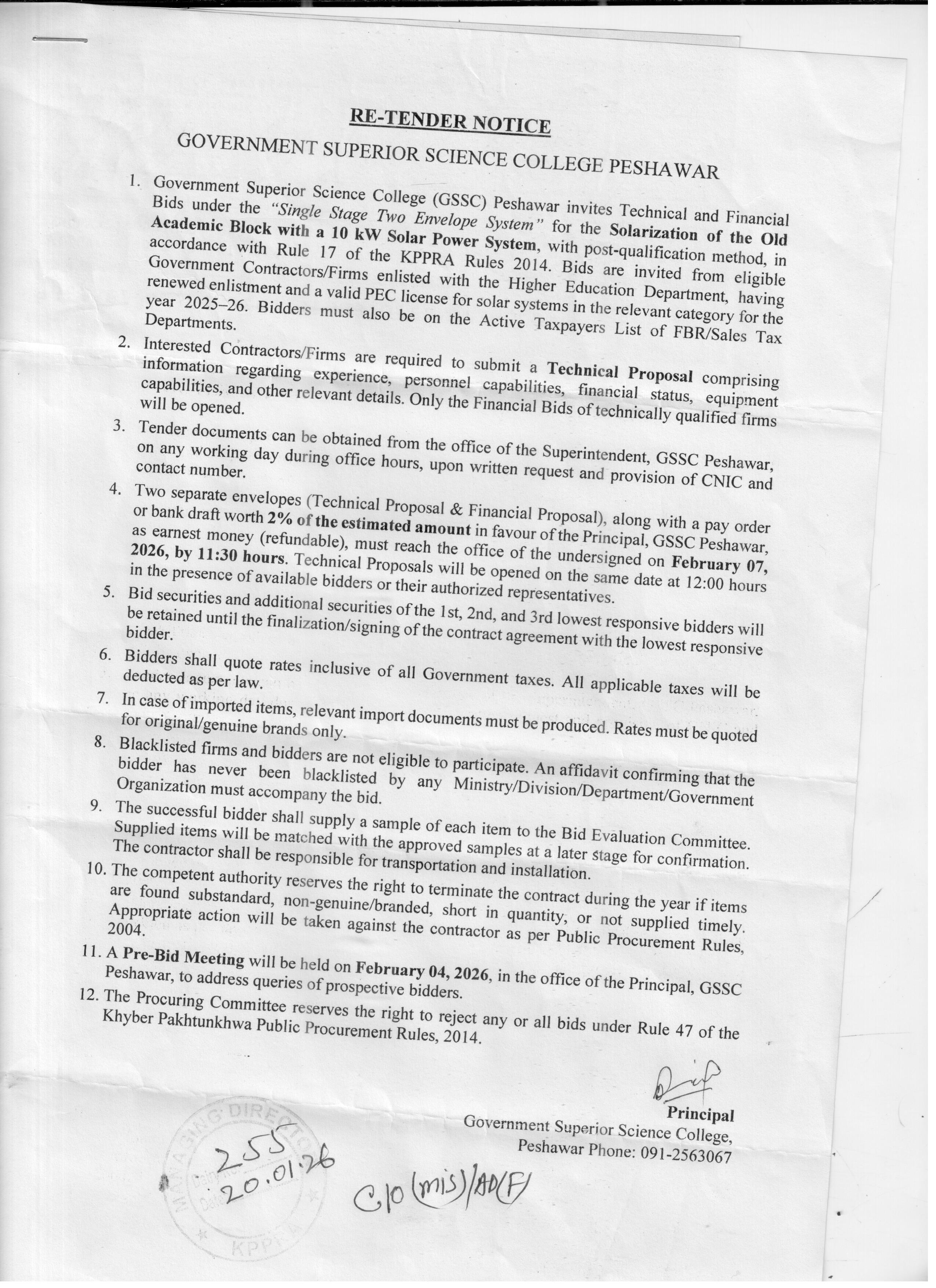 The submission deadline is set for February 7, 2026, by 11:30 AM, with technical bids opening at 12:00 PM on the same day. Bids must be submitted to the office of the Superintendent, Government Superior Science College, Peshawar. A pre-bid meeting will be held on February 4, 2026, at the Principal's office to clarify any queries.