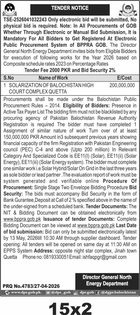 The Director General North Energy Department in Quetta, Balochistan, is procuring solarization works for the Balochistan High Court Complex. This project involves the installation of solar energy systems to enhance the energy efficiency and sustainability of the court complex. The procurement is based on composite schedule rates 2023 on percentage rates for the financial year 2026.