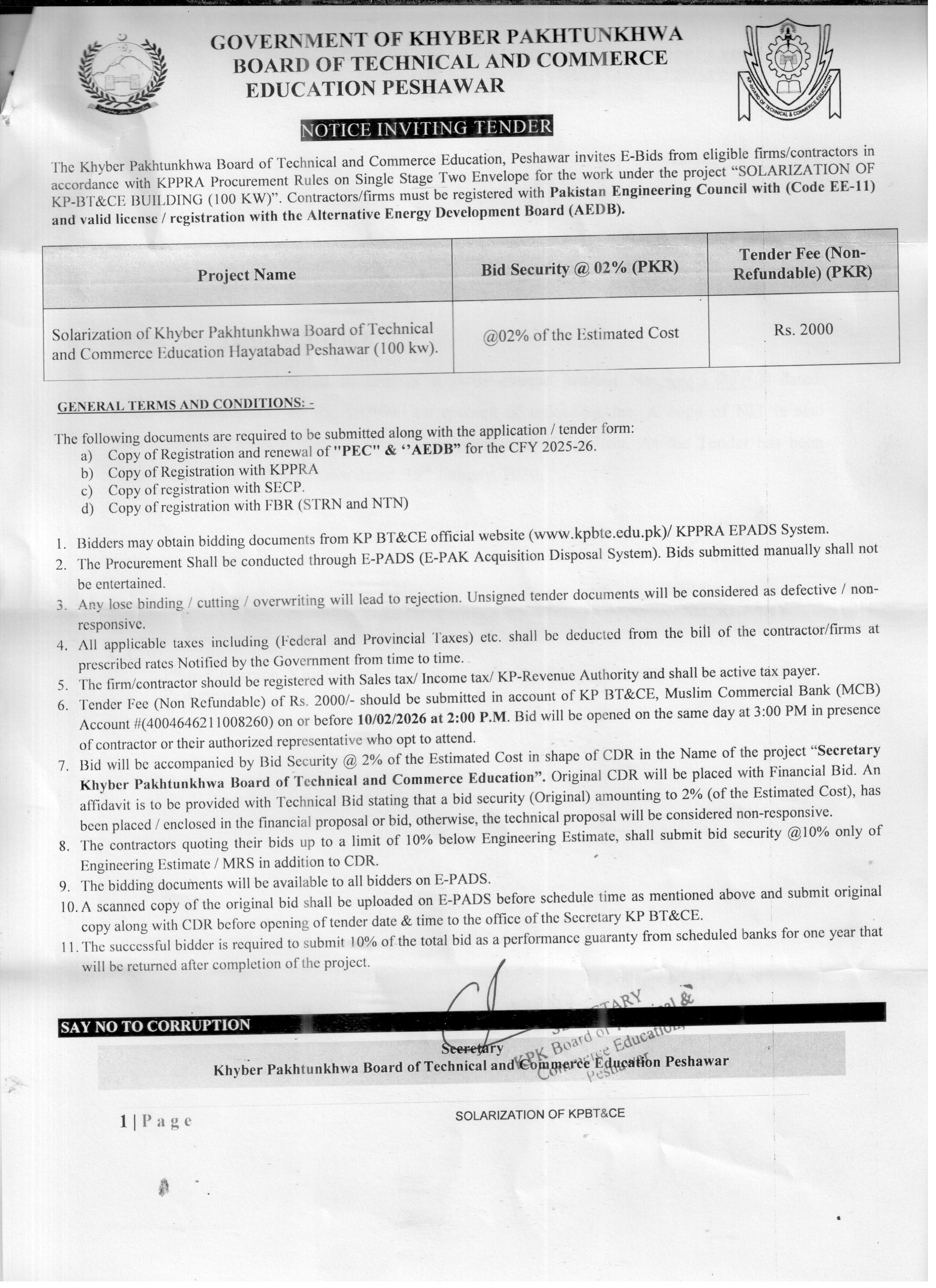 This tender invites qualified contractors in Peshawar to undertake the solarization project for the Khyber Pakhtunkhwa Board of Technical and Commerce Education Hayatabad campus. The project involves installing a 100 KW solar power system, aimed at enhancing energy efficiency and reducing electricity costs for the educational board.