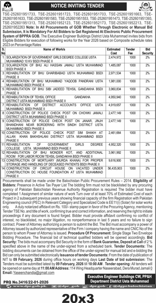 This tender invites bids for solarization and rehabilitation works at various government buildings in Usta Muhammad, Balochistan, under the Public Works and Housing Department. The scope includes solar power installations at girls degree colleges and basic health units, rehabilitation of multiple BHUs and offices, and construction of police check posts and mortuary facilities. The projects are based on composite schedule rates for the fiscal year 2026, emphasizing sustainable energy solutions and infrastructure improvements in the district.