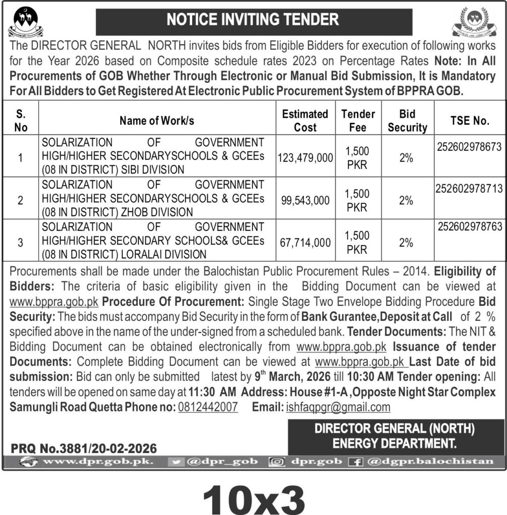 This tender invites bids for the solarization of government high and higher secondary schools along with GCEEs across three divisions: Sibi, Zhob, and Loralai in Balochistan. The Energy Department, Balochistan, is spearheading this initiative to enhance renewable energy infrastructure in educational institutions located in these districts, with the main office situated in Quetta. The project involves installing solar power systems to reduce reliance on conventional electricity, ensuring sustainable and uninterrupted power supply for schools.