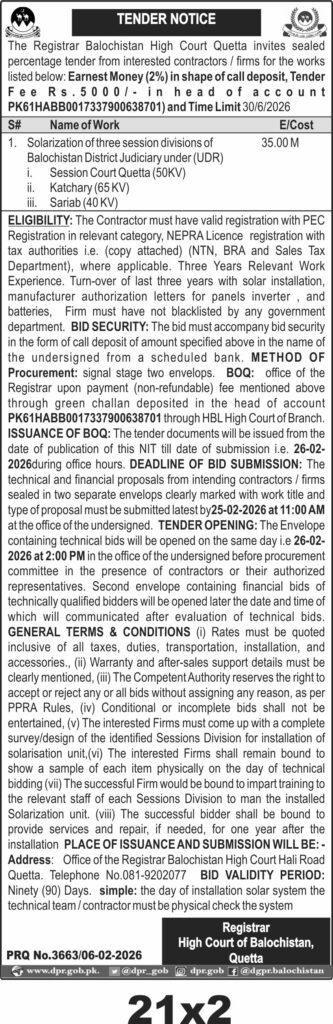 This tender invites contractors in Quetta from the High Court of Balochistan for solarization works across three session divisions under UDR. The project covers installation of solar systems at Session Courts in Quetta (50KV), Katchary (65KV), and Sariab (40KV), aiming to enhance energy efficiency and reduce dependency on conventional power sources.