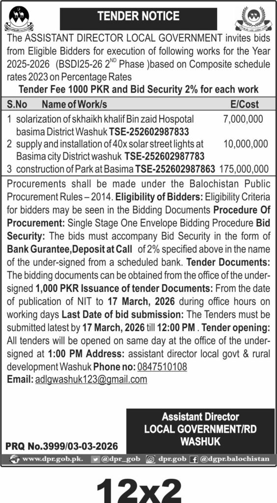 The submission deadline is set for 17 March 2026 at 12:00 PM, with tender opening at 1:00 PM the same day. Bids must be submitted physically to the office of the Assistant Director Local Government & Rural Development Washuk. Interested parties should prepare their technical and financial bids carefully, ensuring all documentation is complete and timely.