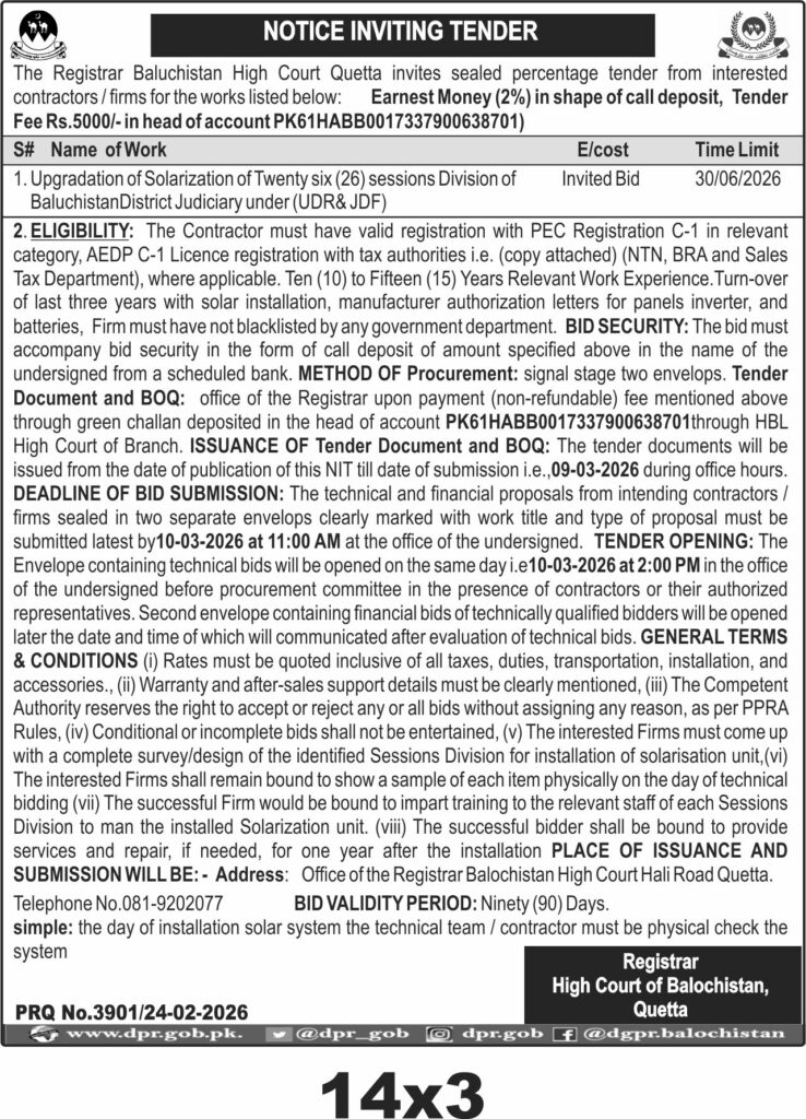 This tender invites contractors in Quetta from the High Court of Balochistan for upgrading solarization across 26 sessions divisions under the district judiciary. The focus is on solar power installation and related electrical works.