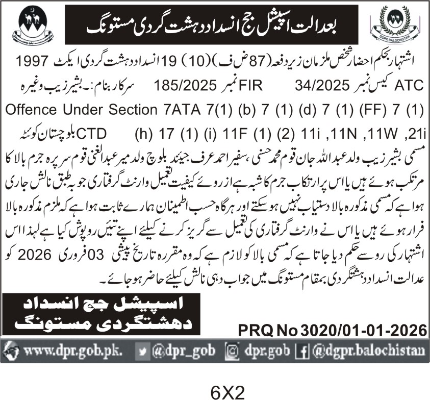 ποΈ Issuing Authority:Special Court for Anti-Terrorism Mastung
