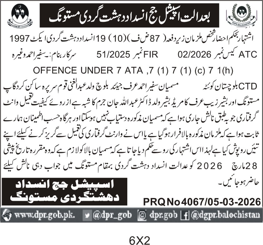 The submission deadline for responses or appearances is set for 28 March 2026, with proceedings to be held at the Anti-Terrorism Court Mastung. Interested parties or legal representatives should ensure their presence and submissions by this date to avoid legal consequences.