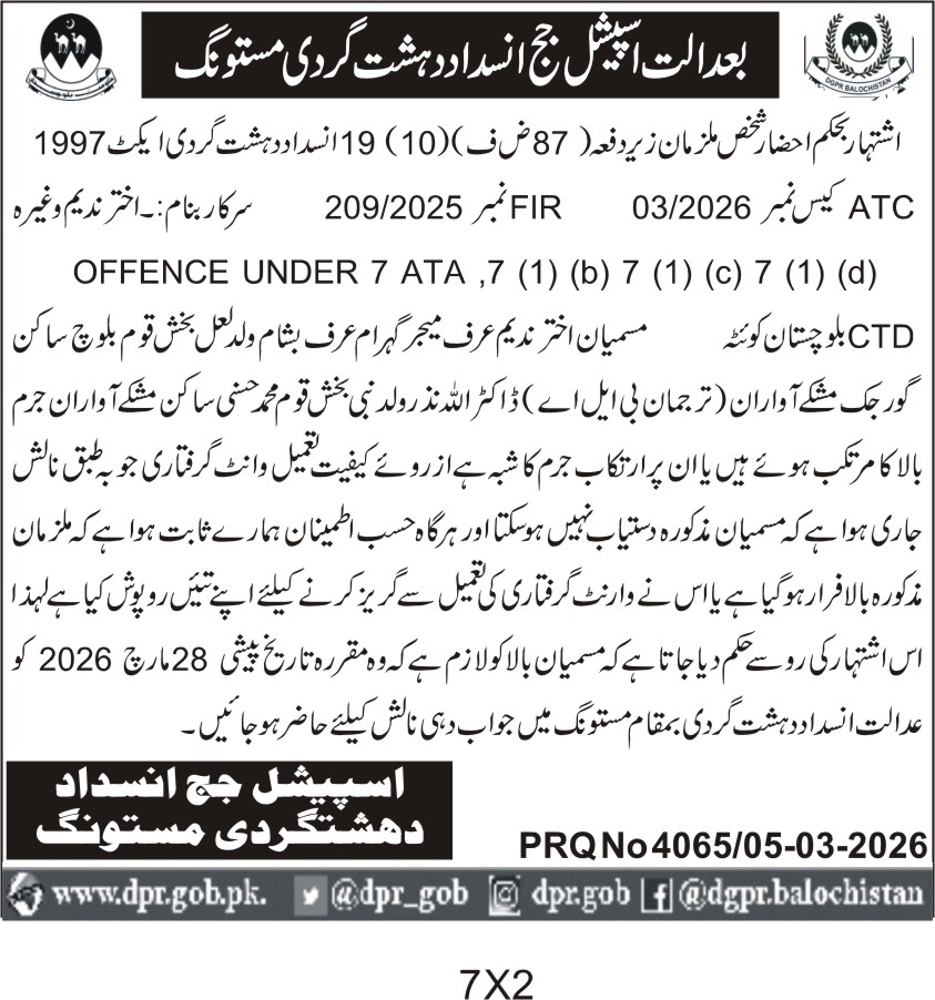 The final submission deadline for responses and appearances is set for 28th March 2026, with proceedings commencing at the Special Court Anti-Terrorism office in Quetta. All parties must be present and prepared to respond to the charges within this timeframe to avoid legal consequences.