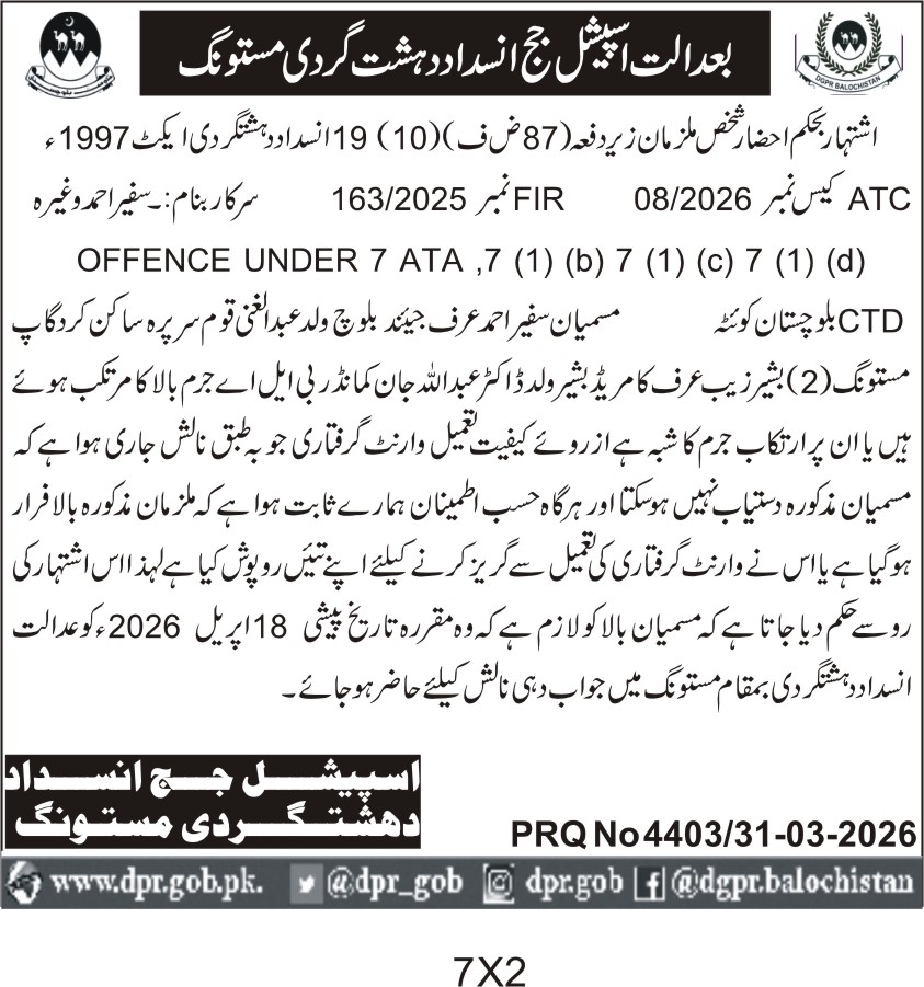 This notice from Mastung's Special Court announces a critical judicial proceeding related to a terrorism case under FIR number 163/2025. The department requires legal adjudication services concerning a high-profile case involving serious charges under ATA sections 7(1)(b), 7(1)(c), and 7(1)(d). The case involves accused individuals linked to a significant criminal act in Mastung, Balochistan.