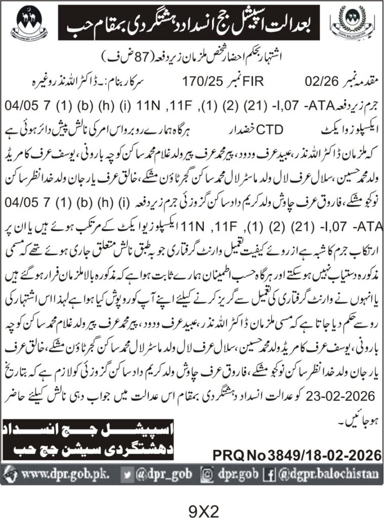 The deadline for appearance and submission of responses is set for 23rd February 2026, with proceedings scheduled at the Anti-Terrorism Court premises in Quetta. All concerned must ensure their presence or legal representation by this date to avoid adverse legal consequences.