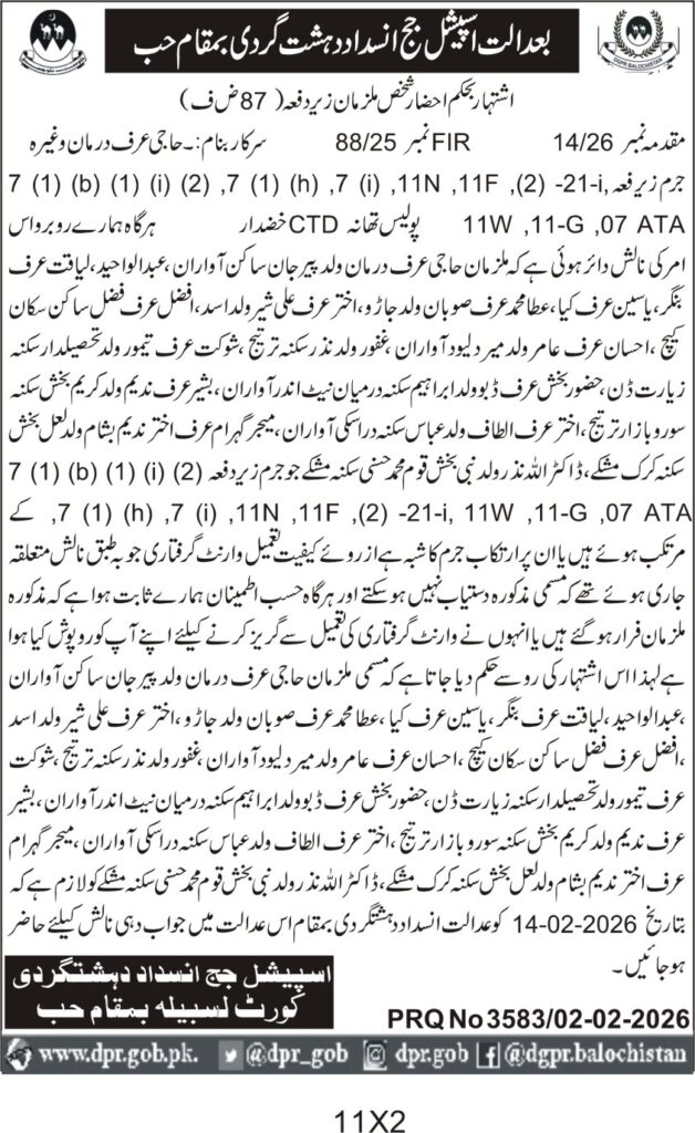 ποΈ Issuing Authority:Special Judge Anti-Terrorism Court Balochistan