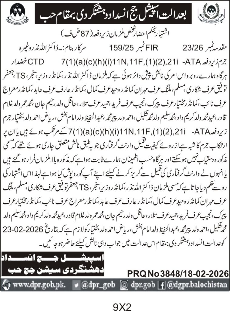This notice from the Special Judge Anti-Terrorism Court Hub in Balochistan invites responses regarding the summons of accused persons involved in a case registered under FIR No 23/26. The summons pertain to individuals charged under various sections of the Anti-Terrorism Act (ATA), including 7(1)(a)(c)(h)(i), 11N, 11F, (1)(2), and 21i. The court requires the presence of these accused for legal proceedings in Hub city.