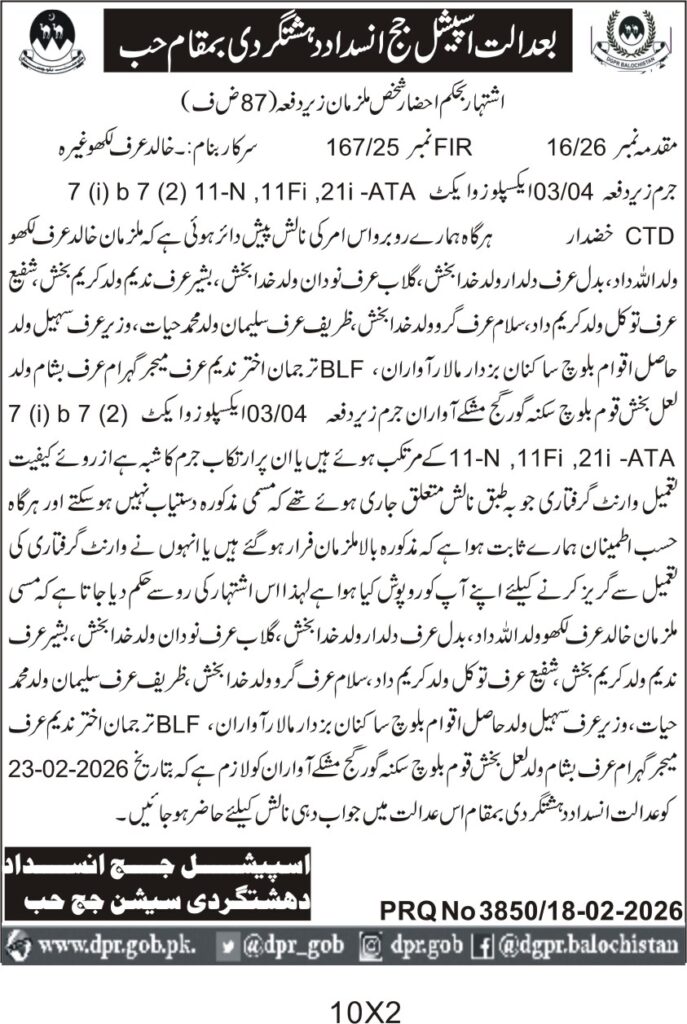 Legal Notice for Arrest Warrants under Anti-Terrorism Act in Balochistan